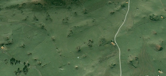 La localización de los atrincheramientos carlistas que defendían los altos situados entre Ramales, las peñas del Moro y el Mazo y Gibaja es más complicada. Hasta el momento sólo he conseguido identificar con seguridad una de las posiciones: la del alto del Pindio, al sureste de Guardamino. Se trata de una cima no muy alta, muy amplia y bastante llana, sobre la que se aprecian restos de terraplenes que la defienden por el Sur y Oeste. "Descubrí" esas evidencias, siempre sobre foto aérea, hace ya unos cuantos años y pensé que era un poblado fortificado de la Prehistoria Reciente, un castro o incluso un campamento romano algo extravagante, aunque había algo que no terminaba de encajar y que me hizo dejarlo en esa larga lista de "cosas raras" que manejo y que tengo medio abandonada. Sin embargo, al revisar los planos de la batalla, hace no mucho, caí en la cuenta de que sí que era una fortificación, aunque de campaña y de hace menos de dos siglos, ya que se trata sin duda de uno de esos escurridizos atrincheramientos carlistas representados en los croquis.